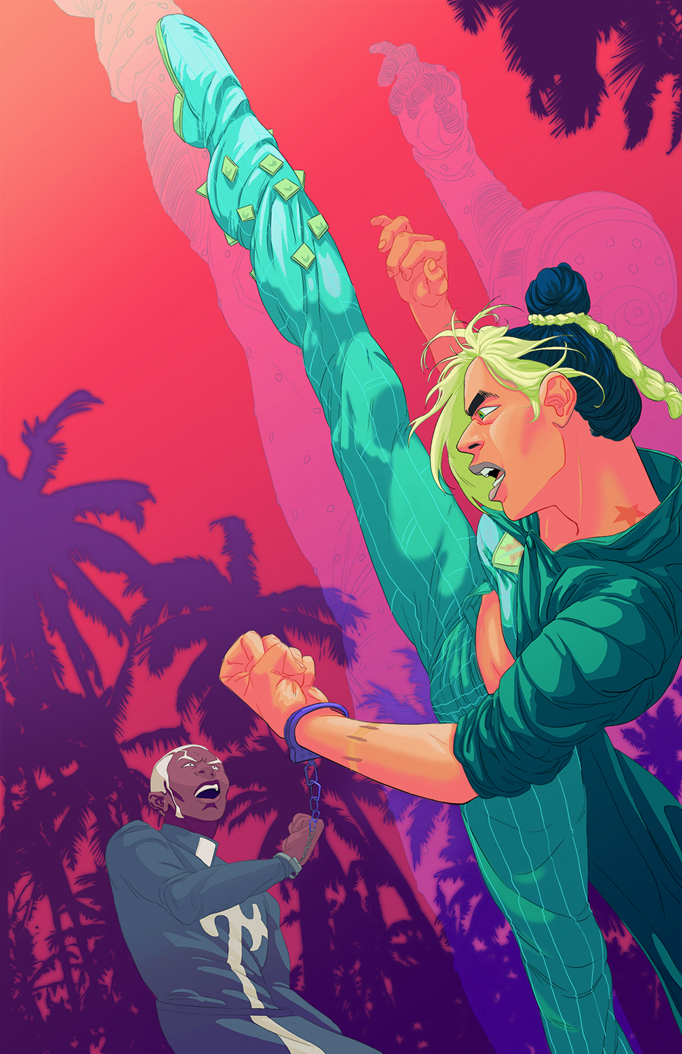 Jolyne's high kick from chapter 93 of Stone Ocean, available in both 11x17 and 6.75x10